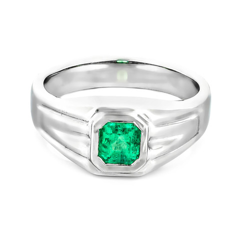 Mens Emerald Ring in White Gold: Colombian Emerald Jewelry | Mens White Gold Emerald Ring | Featuring a Natural Vivid Green Tone Emerald of 0.67 Carat Weight mounted in a White Gold Bezel Set.