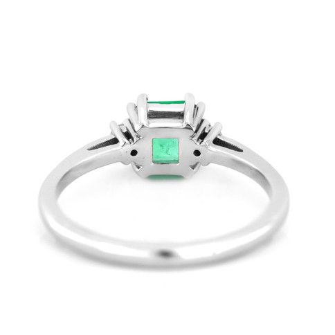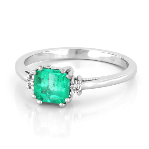 Natural Colombian Emerald Ring with Side Diamonds | Colombian Emerald Jewelry | A 14k Solid White Gold Ring Featuring a Clean and Vivid Green Emerald Stone of 0.84 Carat Weight with two side White Diamonds.