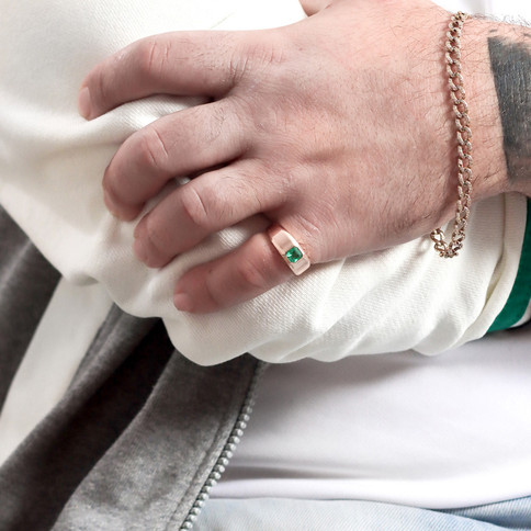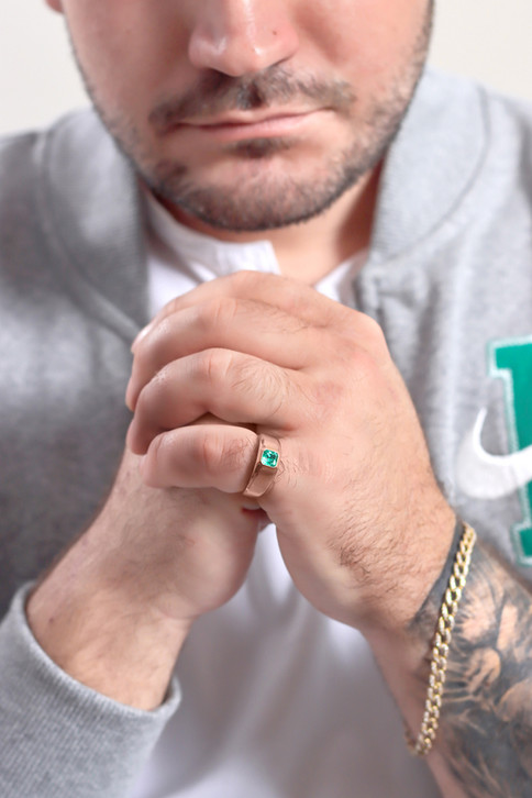Colombian Emerald Jewelry | Mens Rose Gold Emerald Ring | Featuring a Natural Vivid Green Tone Emerald of 0.70 Carat Weight mounted in a Rose Gold Bezel Set.