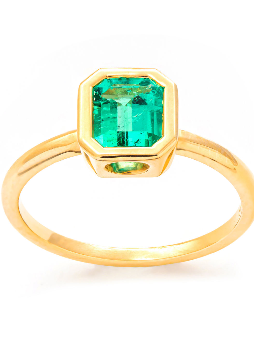 Experience the captivating beauty of a genuine emerald, perfectly protected in a modern bezel setting. This exquisite ring is a timeless symbol of sophistication, ideal for everyday wear or special occasions.