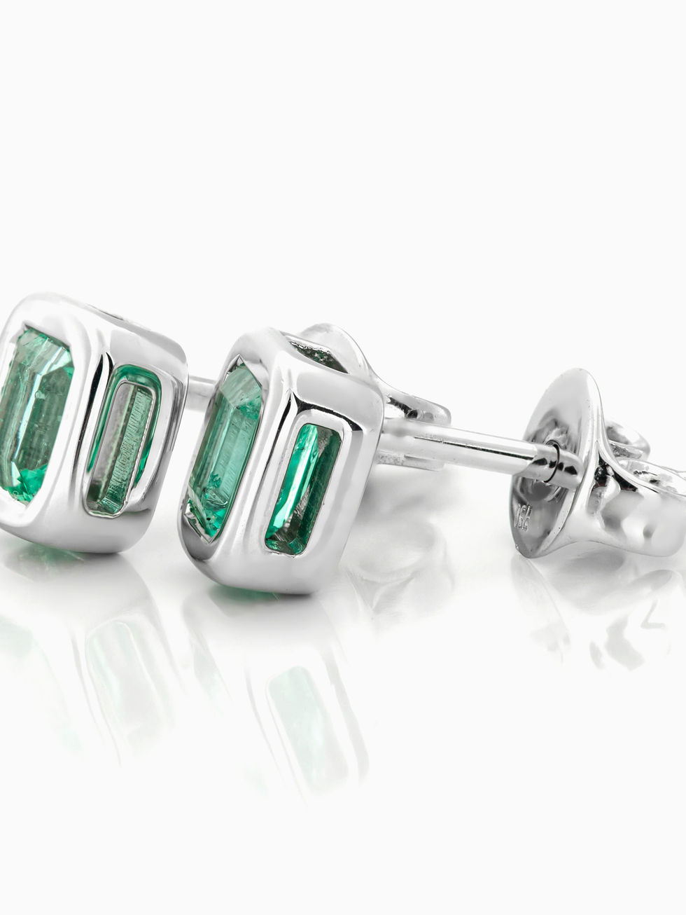 White Gold Colombian Emerald Jewelry | Colombian Emerald Earrings Studs | Set with two Natural Emerald Gems of 0.78 ct Total Carat Weight | Lightly Included with a Vibrant Blueish Green Tone.